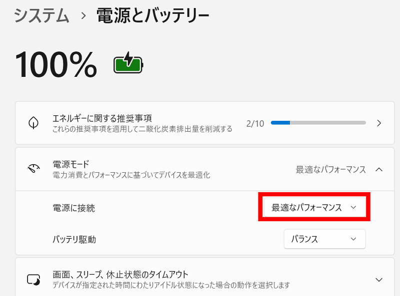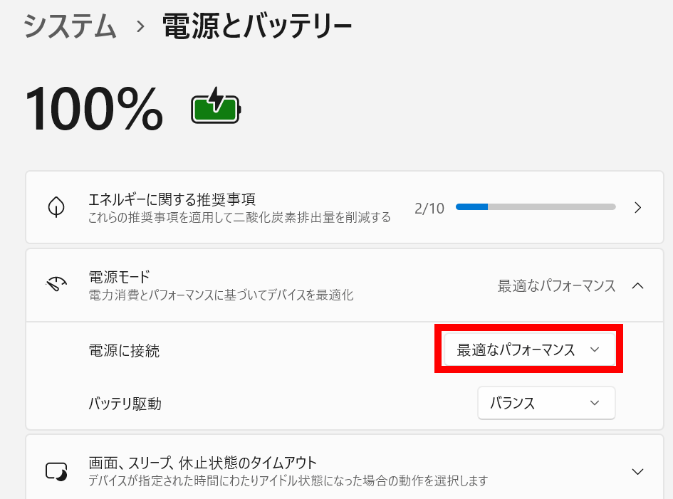 ベンチマークテストを実行する前にWindowsの設定で電源モードを「最適なパフォーマンス」に変更。