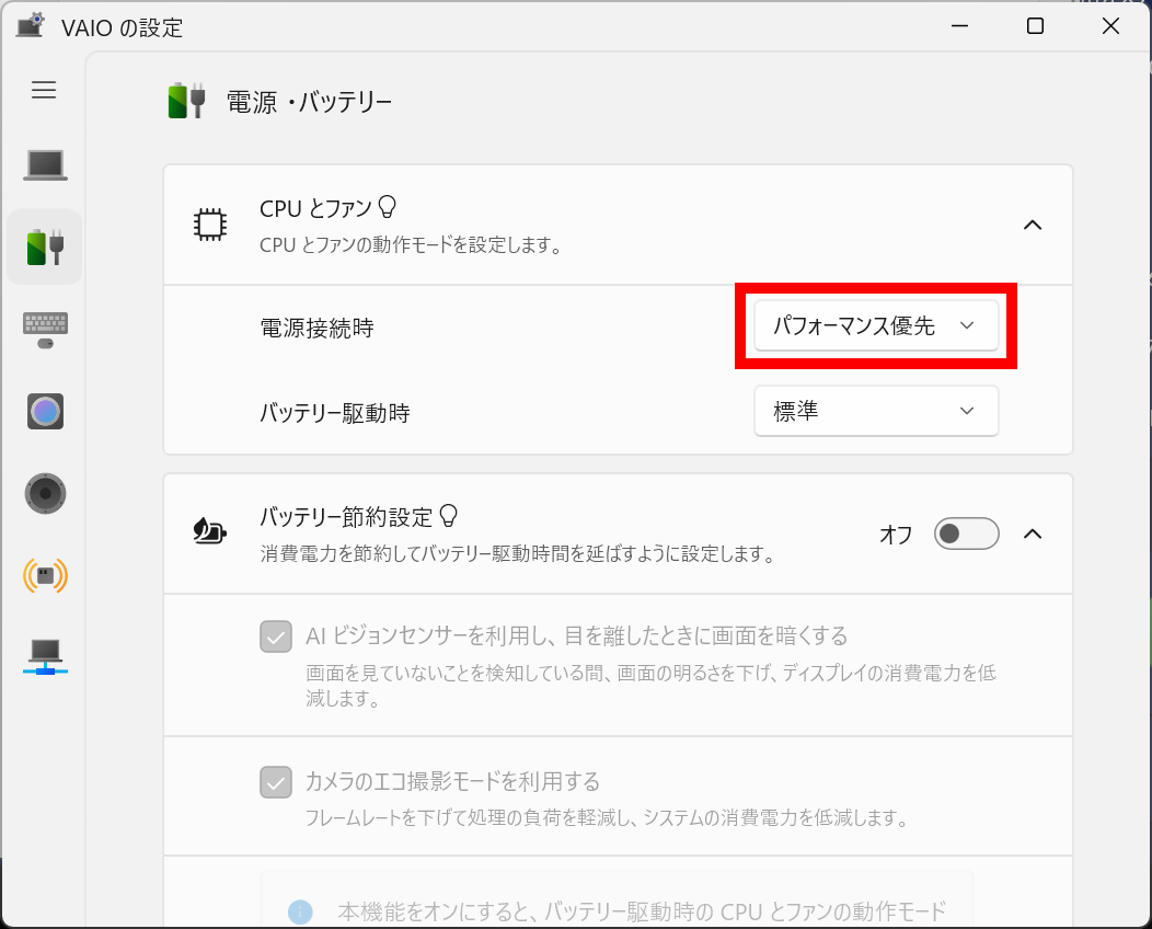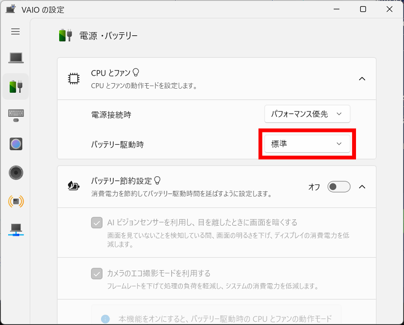 VAIOの設定でもバッテリー駆動時の動作モードを「標準」に設定します。