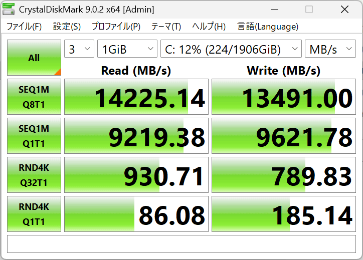 まずはストレージ速度測定アプリの「CrystalDiskMark」を実行。シーケンシャル読み込み速度は14225.14MB/s、シーケンシャル書き込み速度は13491.00MB/s、ランダム読み込み速度は930.71MB/s、ランダム書き込み速度は789.83MB/sでした。かなり高速です。