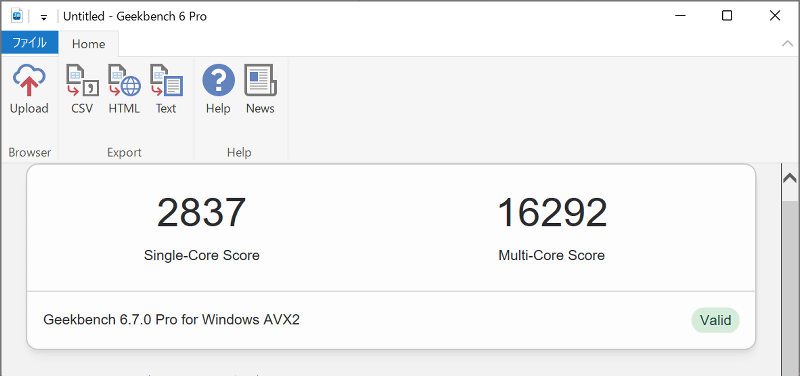 定番ベンチマークアプリの「Geekbench 6」でCPU性能をテストした結果が以下。シングルコアスコアは2837、マルチコアスコアは16292でした。