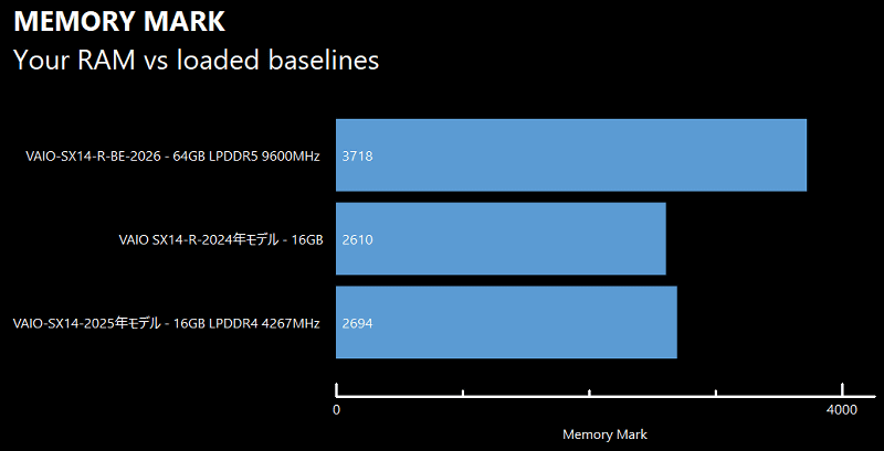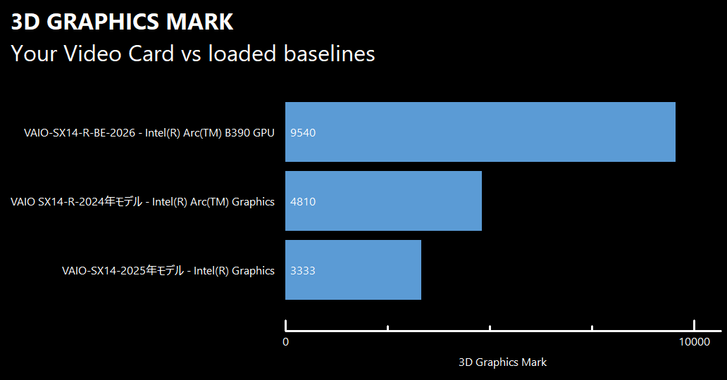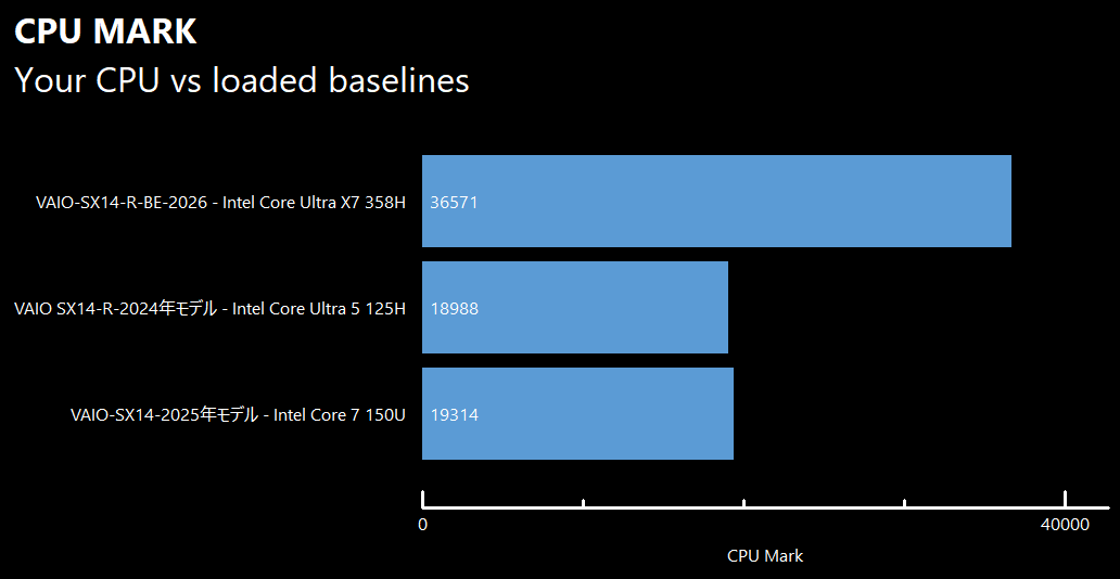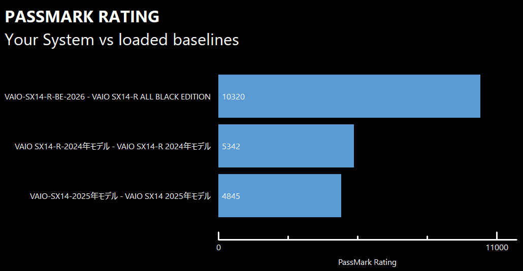ベンチマークアプリ「PassMark PerformanceTest」を実行してVAIO SX14-R │ ALL BLACK EDITIONの性能を過去モデルの「VAIO SX14-R(2024年モデル)」およびコンパクトモバイルモデルの「VAIO SX14(2025年モデル)」と比較してみました。総合スコアは10320で、過去モデルの約2倍のスコアを記録しています。