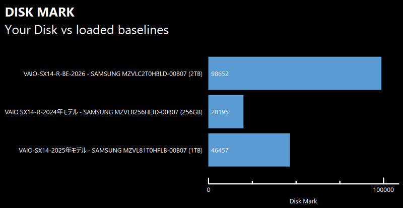 ストレージスコアは98652。全体的に過去モデルやコンパクトモバイルモデルと比べてはるかに高い性能を備えていることが分かります。