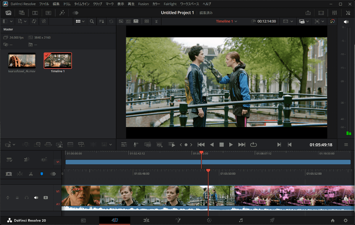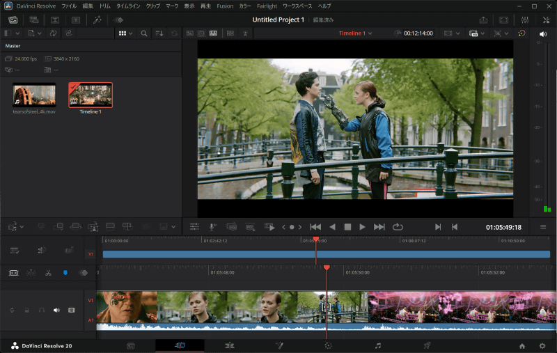 ベンチマークテストだけでなく実際のタスクでの性能を検証するために4K動画のエンコード速度を測定してみます。元データとしてBlenderが無料公開しているショートムービー「Tears of Steel」の4K動画ファイルを使用。ファイルサイズは6.27GB、動画の長さは12分14秒、フレームレートは24fpsです。動画編集アプリの「DaVinci Resolve 20」で読み込んだところ、シーク操作などを引っかかりなくスムーズに実行できました。