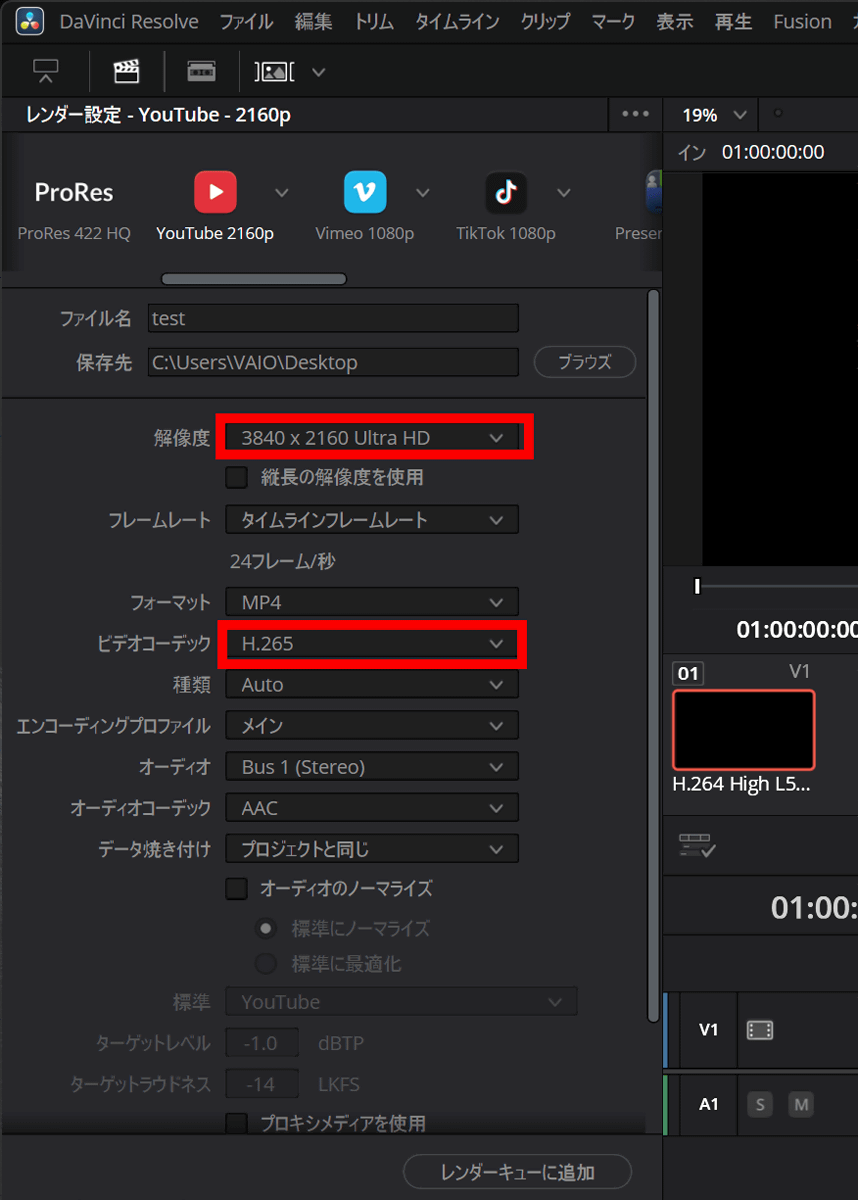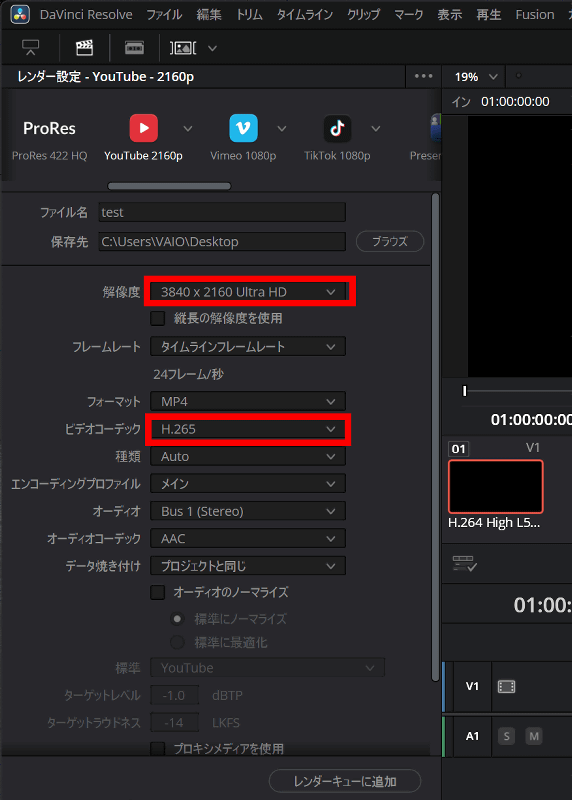 ハードウェアエンコードを有効にしてH.265で3840×2160ピクセルにエンコードします。