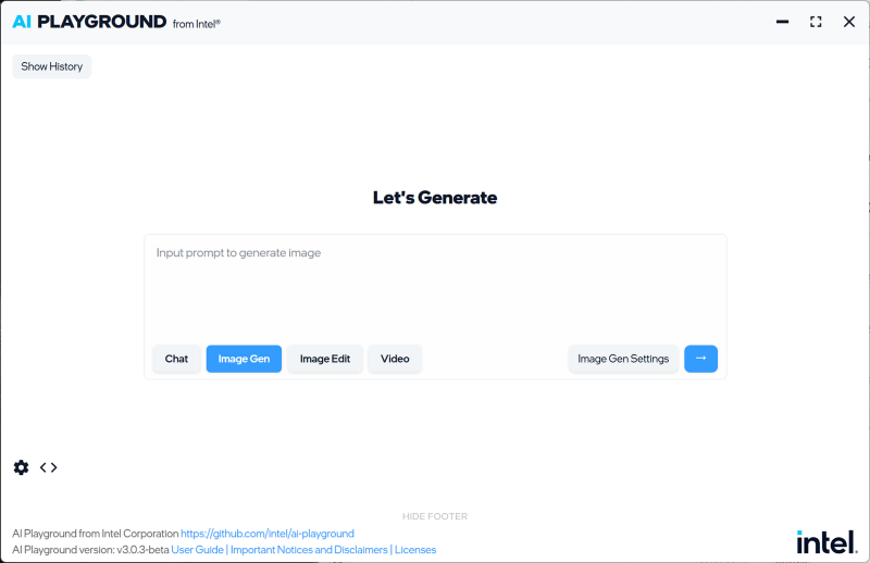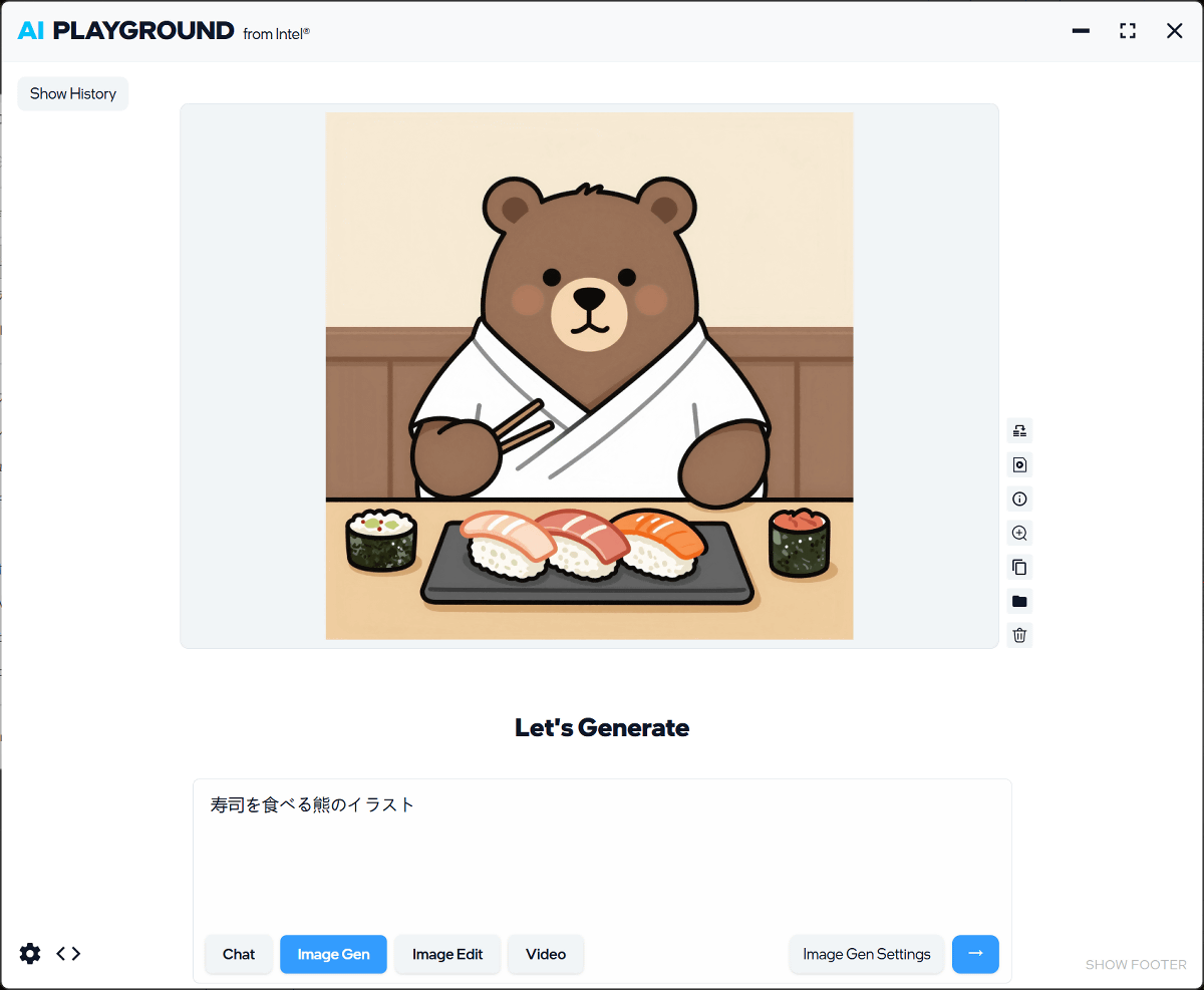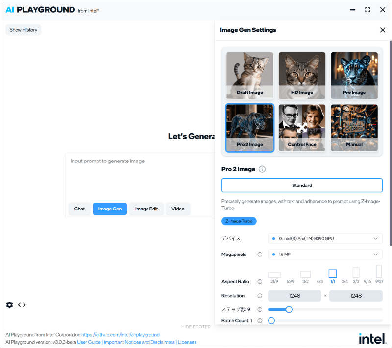 高性能なGPUの実力を検証するために、インテル製AI実行アプリの「AI Playground」で画像生成AIを実行してみます。