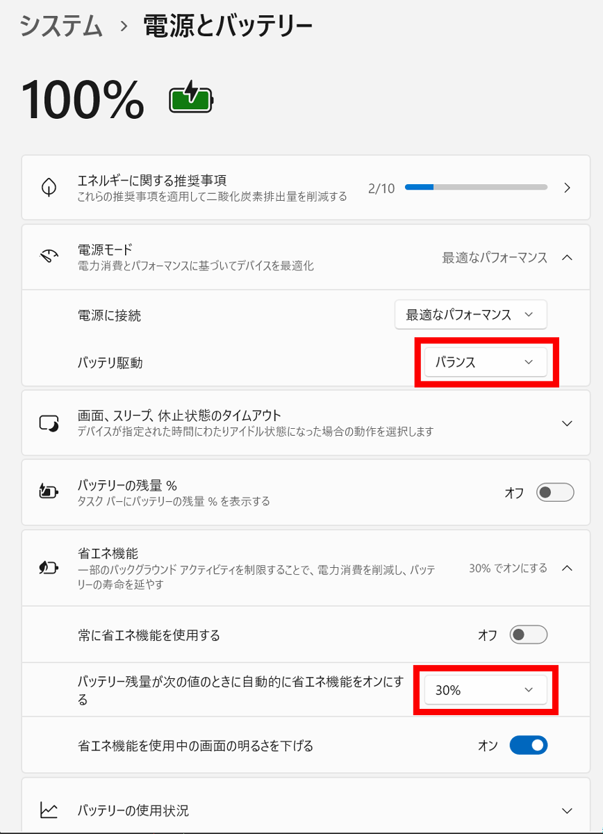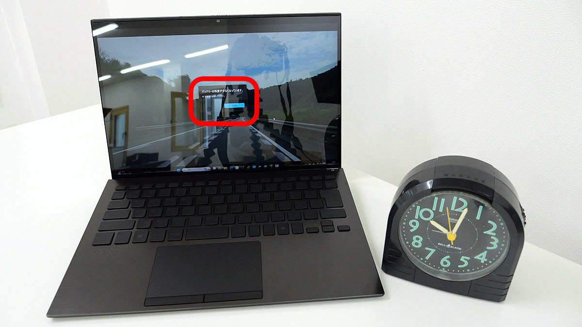 今回借りたVAIO SX14-R │ ALL BLACK EDITIONには通常のバッテリーと大容量バッテリーのいずれかを搭載可能。今回は大容量バッテリーを搭載したモデルを借りたので、バッテリーがどれくらいもつのかを検証してみます。電源モードは「バランス」に設定し、バッテリー残量30%で省エネ機能が有効になるように設定。