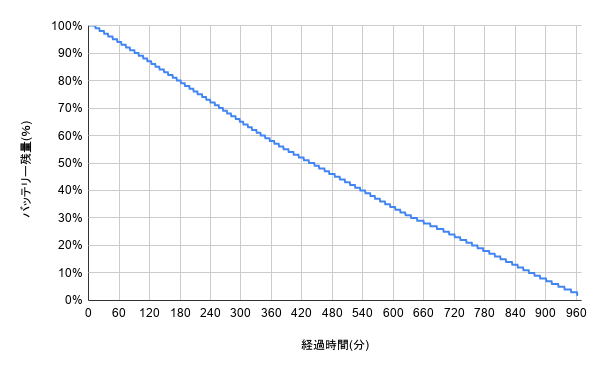 バッテリー残量を1分ごとに記録してグラフ化したものが以下。YouTube動画を16時間以上再生できたので、日常業務でもバッテリー駆動で長時間活躍できます。