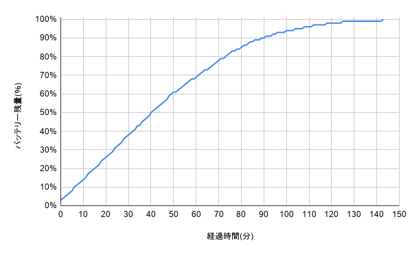 バッテリー残量2%から100%までの推移を1分ごとに記録した結果が以下。30分で38%、60分で69%まで充電でき、100%までにかかった時間は2時間23分でした。