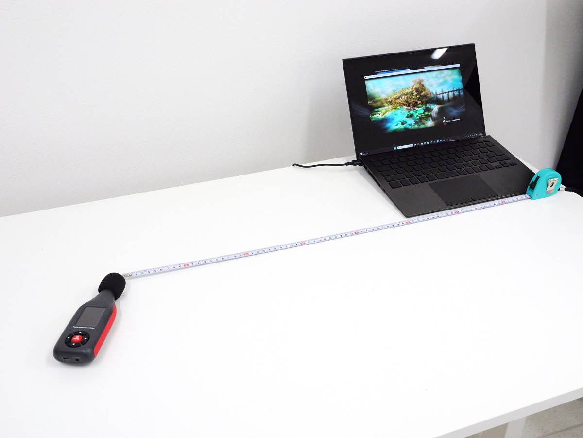 高負荷時の騒音量も測定します。ファイナルファンタジーXIV: 黄金のレガシー ベンチマークを15分間ループ実行して、本体から50cm離れた位置でデジタル騒音計「GainExpress SLM-441」で音量を測定。