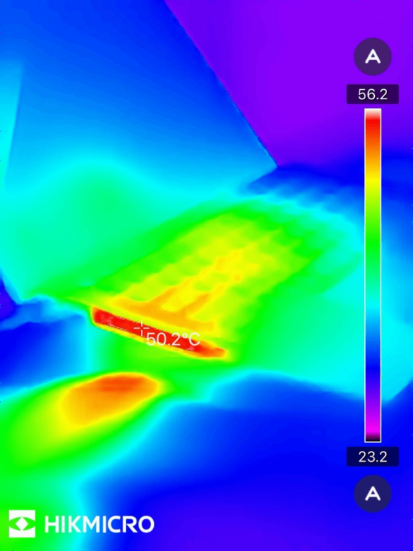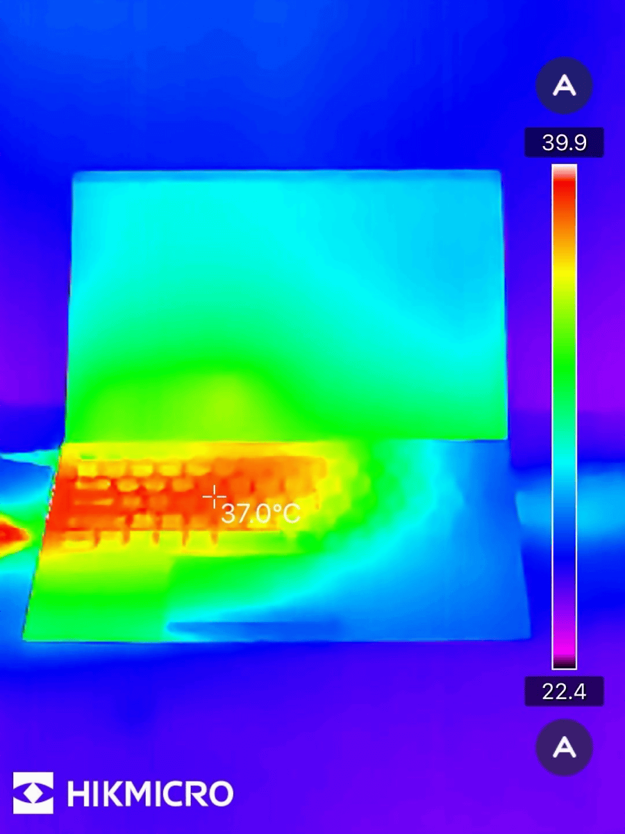 高負荷時の各部の温度を「HIKMICRO Mini2Plus V2」で測定。キーボードは37.0度で、ほとんど熱さは感じません。
