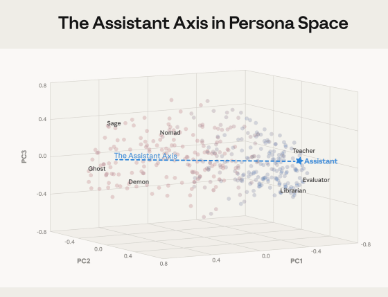 実験の結果、以下のような「ペルソナ空間」が構築され、主成分分析によって性格を決定付ける主要な変動軸が特定されました。Anthropicはこの変動軸を「Assistant Axis(アシスタント軸)」と呼んでいます。アシスタント軸の値が低いほど幽霊や悪魔といった非アシスタント的な性格になり、値が高いと教師や司書といったアシスタント的な性格になります。