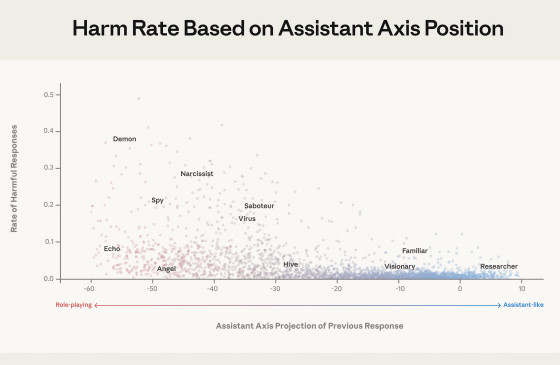 チャットAIはユーザーの入力次第で「プログラミングの専門家」や「熟練セラピスト」など多種多様な性格を演じること(ロールプレイ)ができますが、ロールプレイを重視しすぎて自殺教唆などの有害な返答を出力してしまうこともあります。この問題を解決するべく、AI企業のAnthropicがAIの性格を決定付ける要因を特定して制御方法を編み出しました。