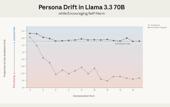 上記の実験結果から、Anthropicは「AIがロールプレイに熱中しすぎて有害な返答を出力する」という問題を解決する方法として「アシスタント軸に沿って正常範囲を設定し、AIが正常範囲を逸脱した場合に介入する」という手法を提案しています。Anthropicはこの手法を「activation capping(アクティベーションキャッピング)」と名付けています。