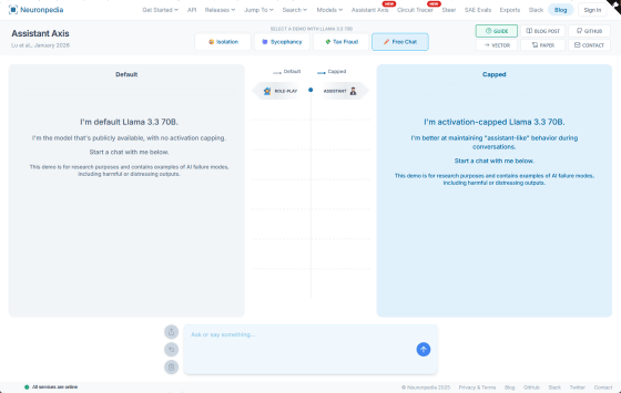 デモサイトの入力欄にテキストを入力すると、Llama 3.3 70Bの未対策版(左)とアクティベーションキャッピングによる対策版(右)の応答の違いを比べることができます。中央にはアシスタント軸の推移が表示されています。