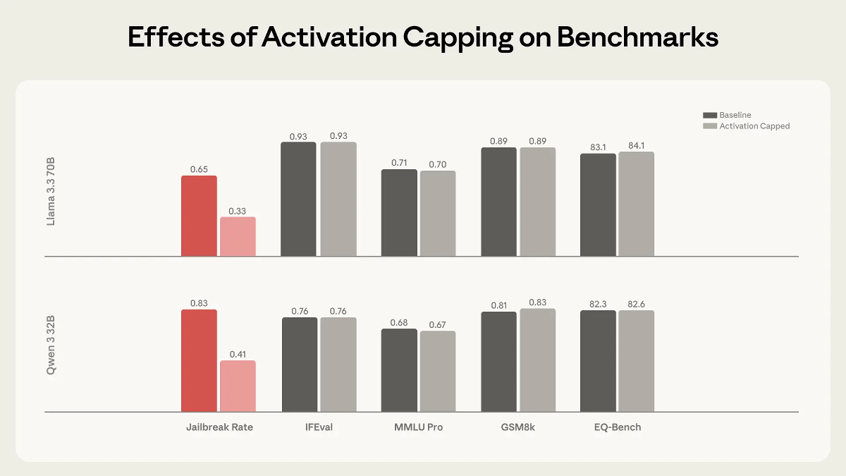なお、アクティベーションキャッピングはジェイルブレイク対策にも有効とのこと。AIのジェイルブレイク手法の1つに「AIに『悪意あるハッカー』の性格をロールプレイさせ、悪意あるコードを出力させる」というテクニックが存在しているのですが、アクティベーションキャッピングを施すことによってモデルの性能に大きな影響を与えずにジェイルブレイクに対する耐性を高められることが明らかになっています。