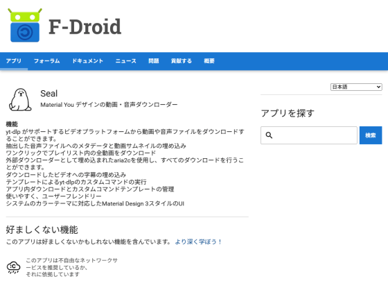 なおサイトに「好ましくない機能」「このアプリは好ましくないかもしれない機能を含んでいます。」と書かれており一瞬ドキッとしますが、「より深く学ぼう!」のリンク先を確認すると「自由ではないネットワークサービスを宣伝、或いは完全に依存している」とあるので、アプリがYouTubeに依存していることを指しているようです。
