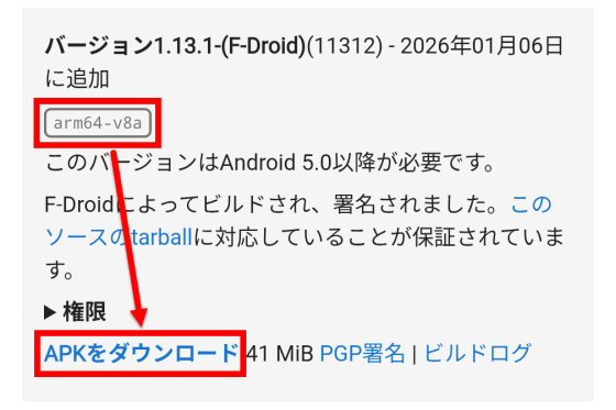 インストールはサイトに置かれているapkファイルを使用します。サイトではまず「F-Droidクライアント」をインストールするのを推奨していますが、今回はSealを直接インストールします。記事作成段階の最新バージョンは1.13.1となっており、同一のバージョンが4つ公開されていますが「arm64-v8a」とラベルされているものをダウンロードします。
