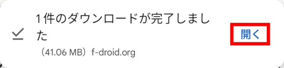 「1件のダウンロードが完了しました」のメッセージが表示されたら続いて「開く」をタップします。