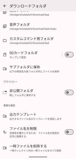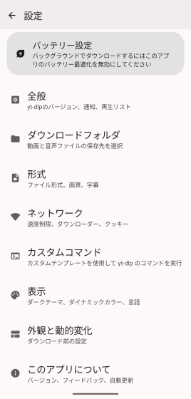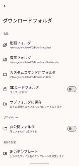 ダウンロードした動画・音声ファイルやカスタムコマンドの保存先を指定できます。出力テンプレートの指定も可能であり、特徴の一つに挙げられていた「アプリ内ダウンロードやカスタムコマンドテンプレートを管理」に関わる項目といえます。