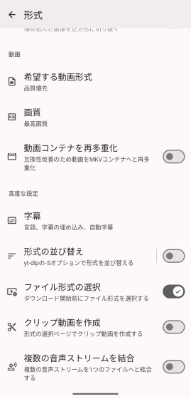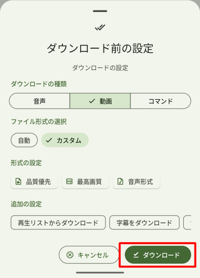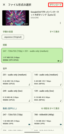 「ダウンロード前の設定」で「ファイル形式の選択」を「カスタム」にした場合はさらに「ファイル形式の選択」画面が表示され、URLで指定した動画の情報を確認しファイル形式を指定できます。基本的には「提案」のファイル形式で問題なさそうですが、音声ファイルとして取得したいなどの要望がある場合は希望するファイル形式を選択し、「ダウンロード」をタップします。