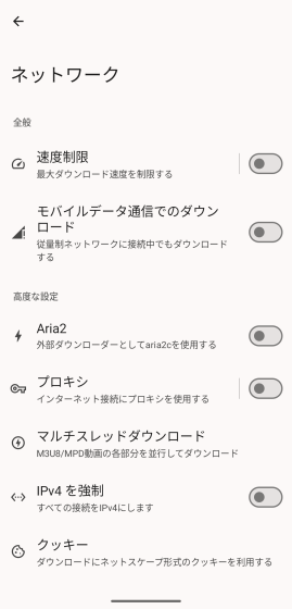 こちらはネットワーク環境に関する設定項目です。特徴の一つでもあるaria2cを外部ダウンローダーとして使用するかどうかを指定する項目はここにありました。