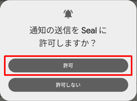 続けてAndroid OSから「通知の送信をSealに許可しますか?」というメッセージが表示されるので「許可」をタップします。