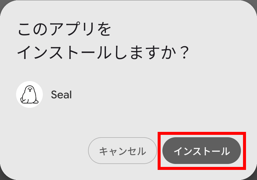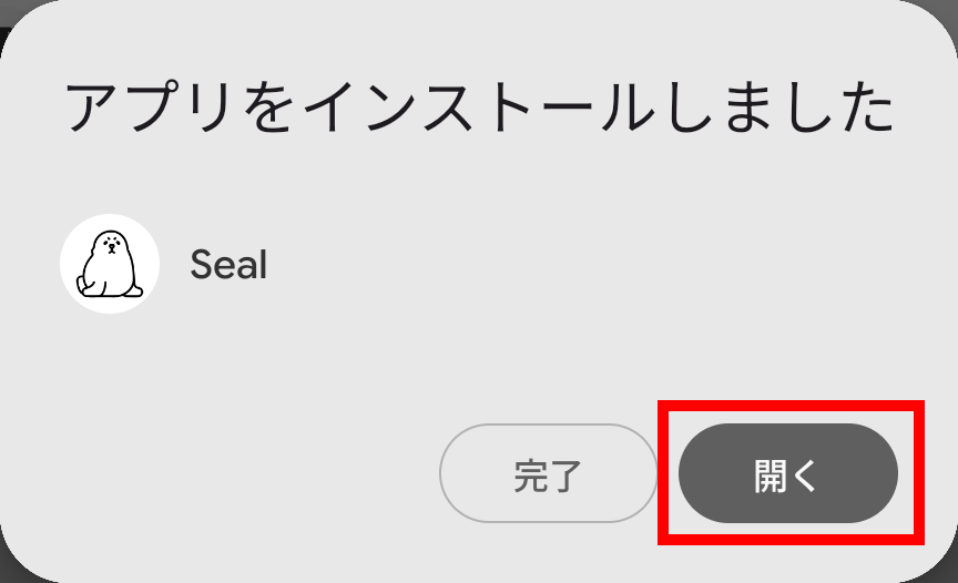 「アプリをインストールしました」と表示されればインストールは完了です。「開く」ボタンをタップするとSealが起動します。