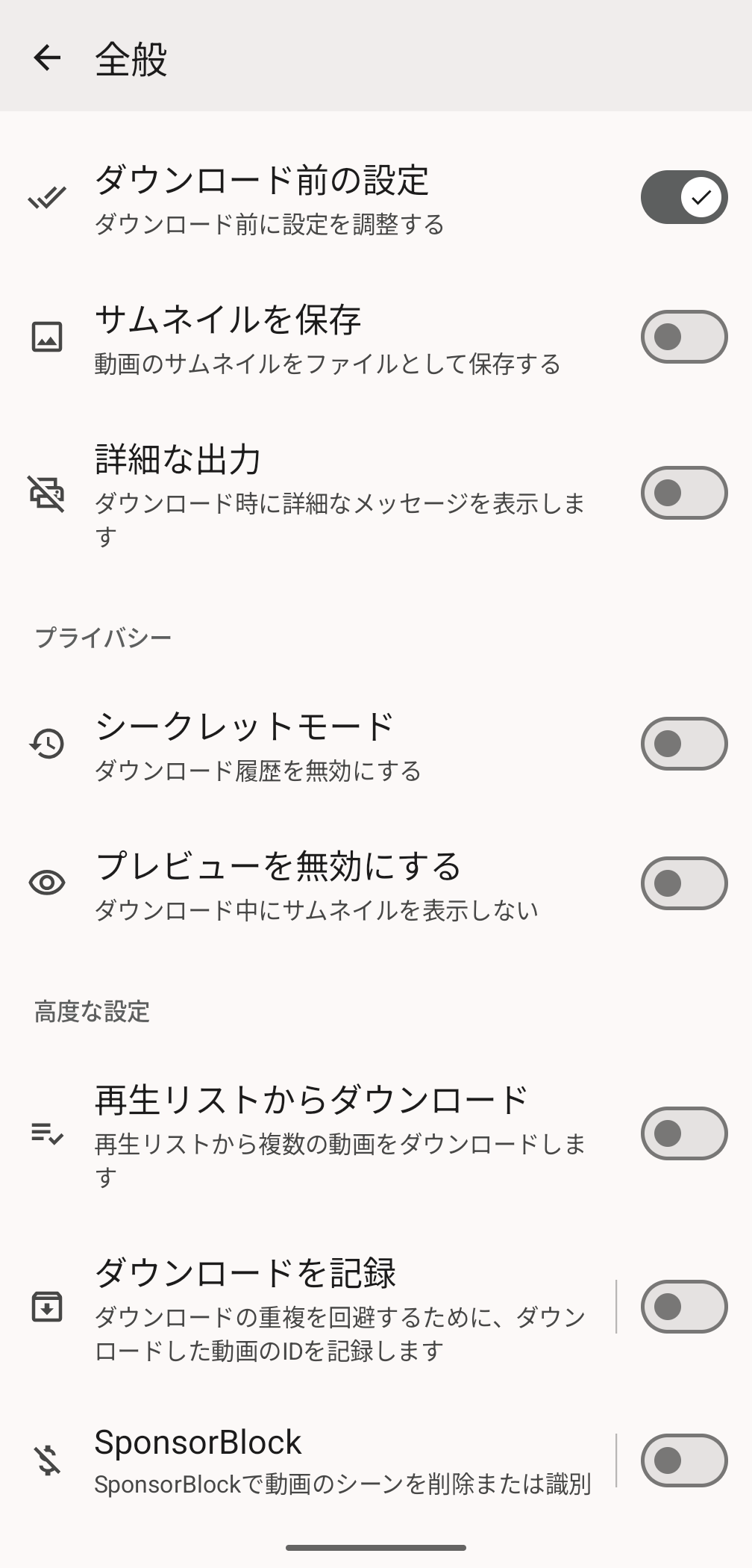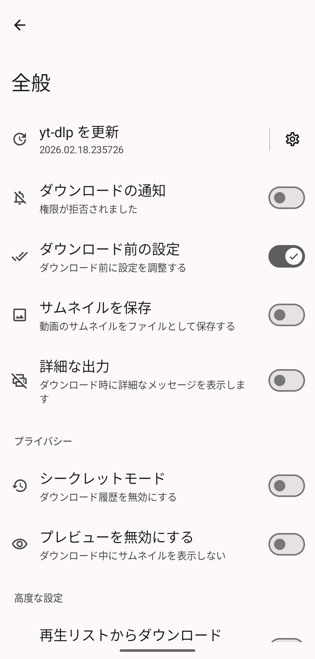 特徴の一つである「プレイリスト内の全動画をワンクリックでダウンロード可能」に関わる項目もありました。