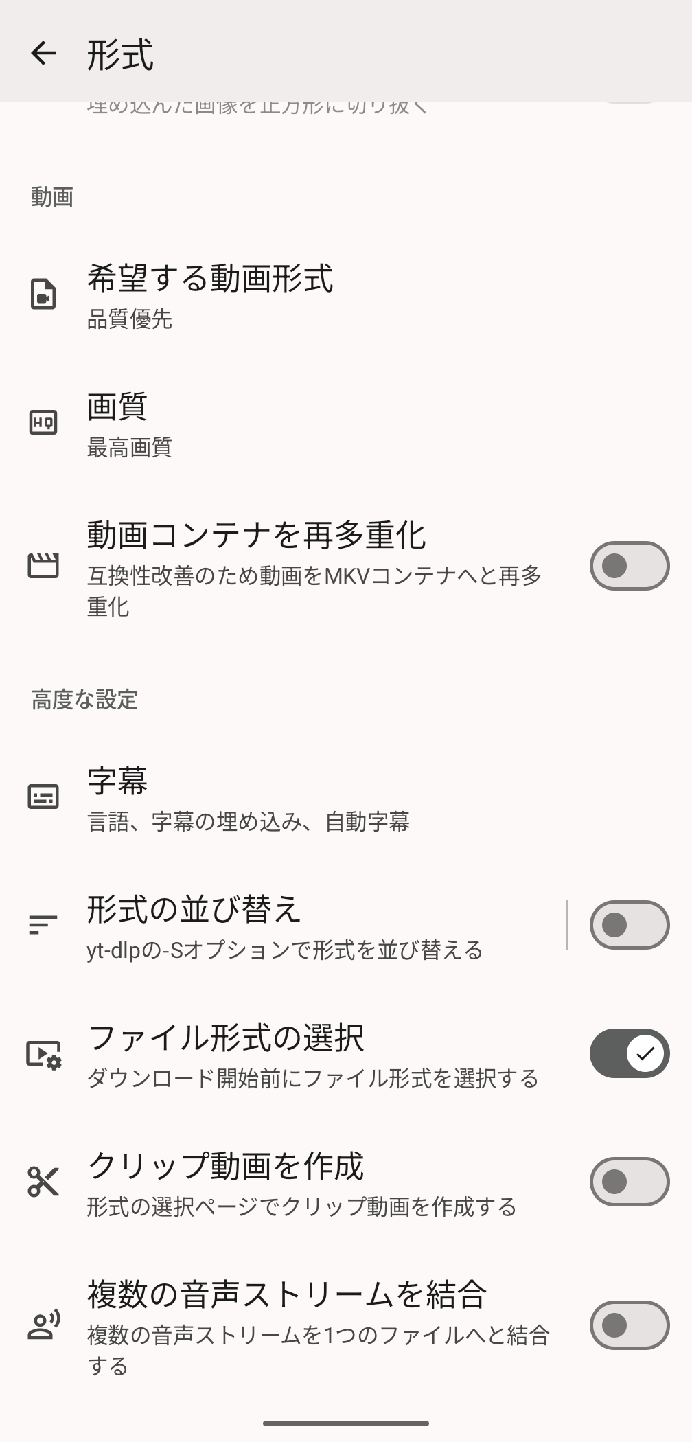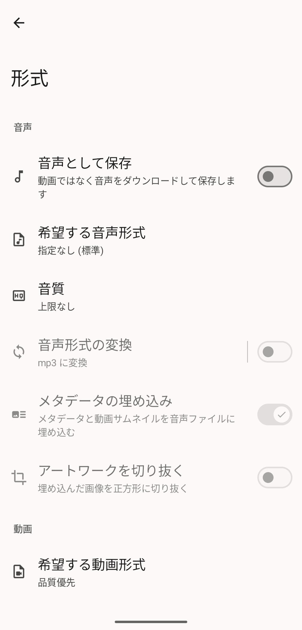 ダウンロード前の「ファイル形式の選択」で「音声」を選択すると「形式の設定」のサブ項目が以下のように変化します。