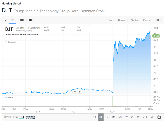 合併の発表を受けて、NASDAQ市場におけるトランプ・メディアの株価は42%上昇し、終値で14.86ドル(約2260円)を記録しました。