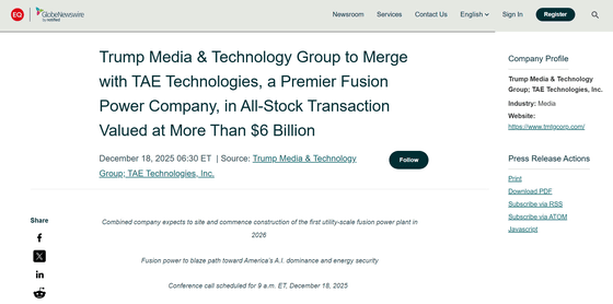 「世界初の実用規模の核融合発電所」建設にトランプ・メディアが合意、Googleが支援する核融合エネルギー企業TAEと60億ドルで合併