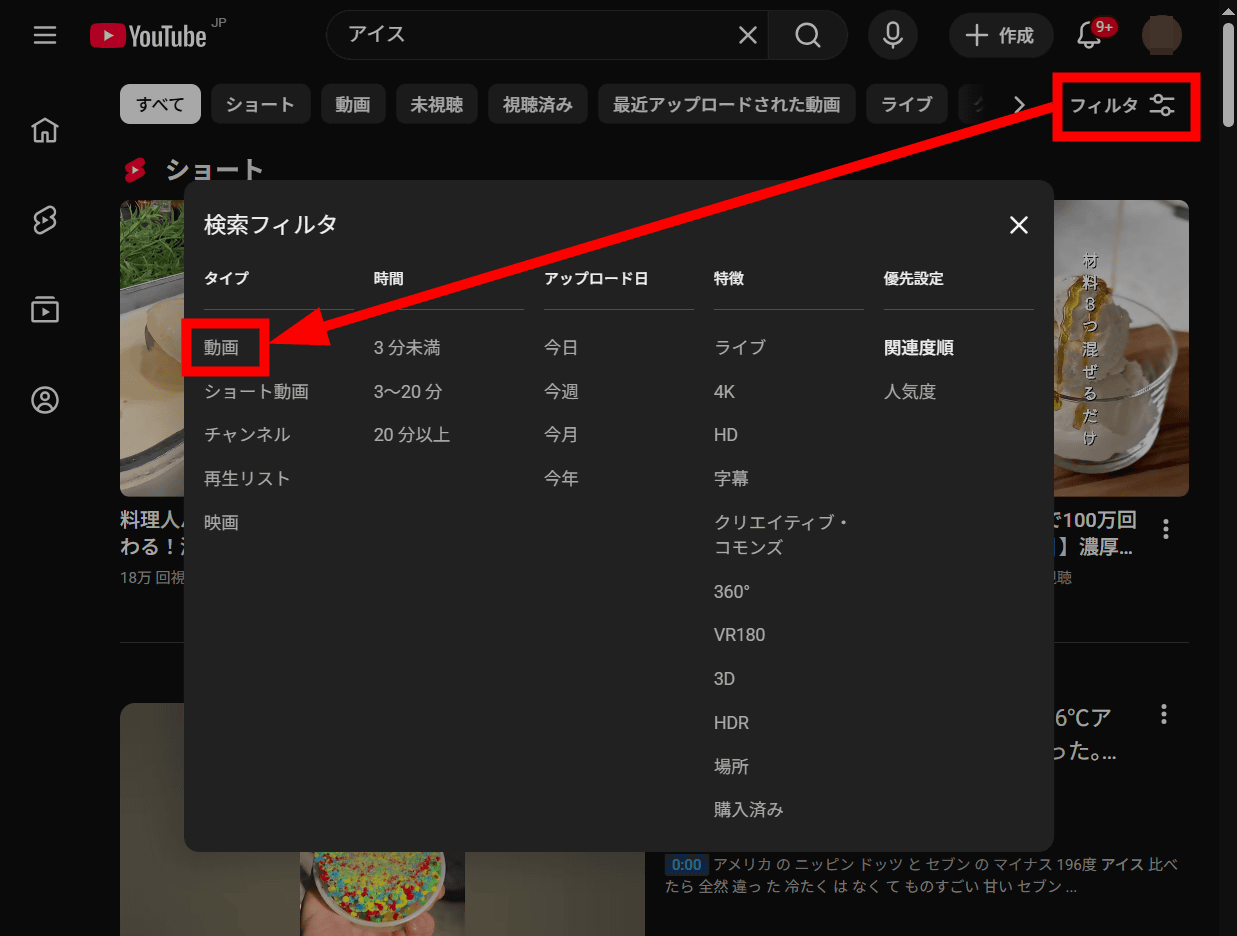 検索フィルタを利用するには、検索ボックスの右下にある「フィルタ」をクリックして、「動画」を選択。