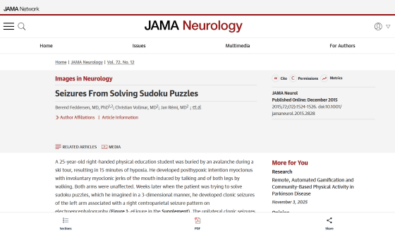 数独はブロックごとに区切られた枠内に1~9の数字を埋めていくパズルであり、英語でも「Sudoku」と呼ばれて世界中で親しまれています。そんな数独を解こうとすると発作が起きるようになってしまった男性の症例報告が、医学誌のJAMA Neurologyに掲載されています。