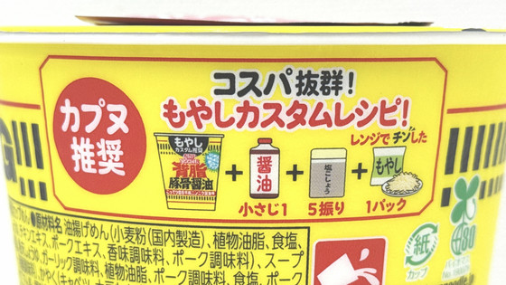 カップヌードル 背脂豚骨醤油 ビッグのパッケージは黄色と黒を基調とした非常に目立つパッケージ。カップヌードルのロゴの上には「もやしカスタム推奨」と大きく書かれています。
