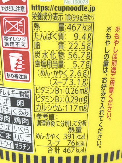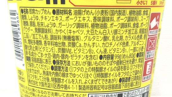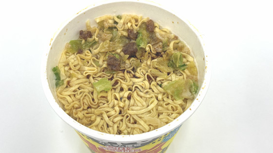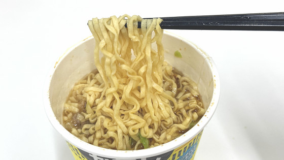 麺はカップヌードルシリーズおなじみの中太縮れ麺ですが、パンチが効いてうま味もしっかりしたスープに比べ、麺はやや力不足な印象を受けました。強いスープには硬めのごわごわとした麺を合わせたいという人は、熱湯を注いでから待つ時間を3分より少し短めにするのもアリかも。