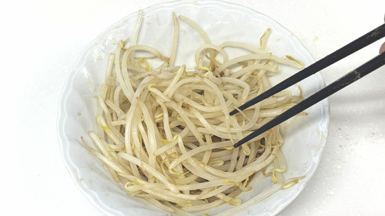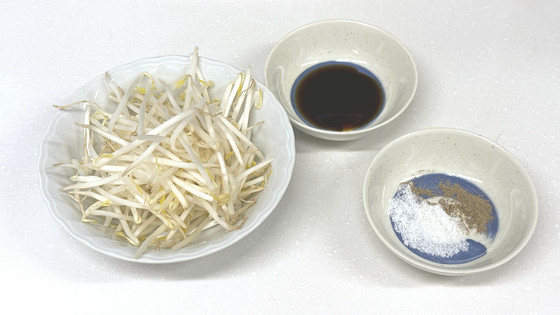 もやしをレンジで数分温めたあと、醤油と塩・こしょうを投入してよく合えます。