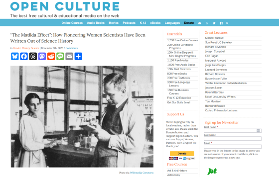 科学の成果は論文・授賞・報道といった形で「誰の業績か」が記録されますが、その過程で貢献者が見えなくなったり、別の人物の手柄として定着したりすることがあります。教育・カルチャー関連の情報を扱うOpen Cultureが、女性研究者の功績が過小評価されやすい現象である「マチルダ効果」を取り上げ、具体例を挙げて「科学史から書き落とされた女性たち」の姿をまとめました。