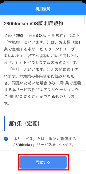 280blockerを起動すると利用規約が表示されるので、「同意する」をタップ。