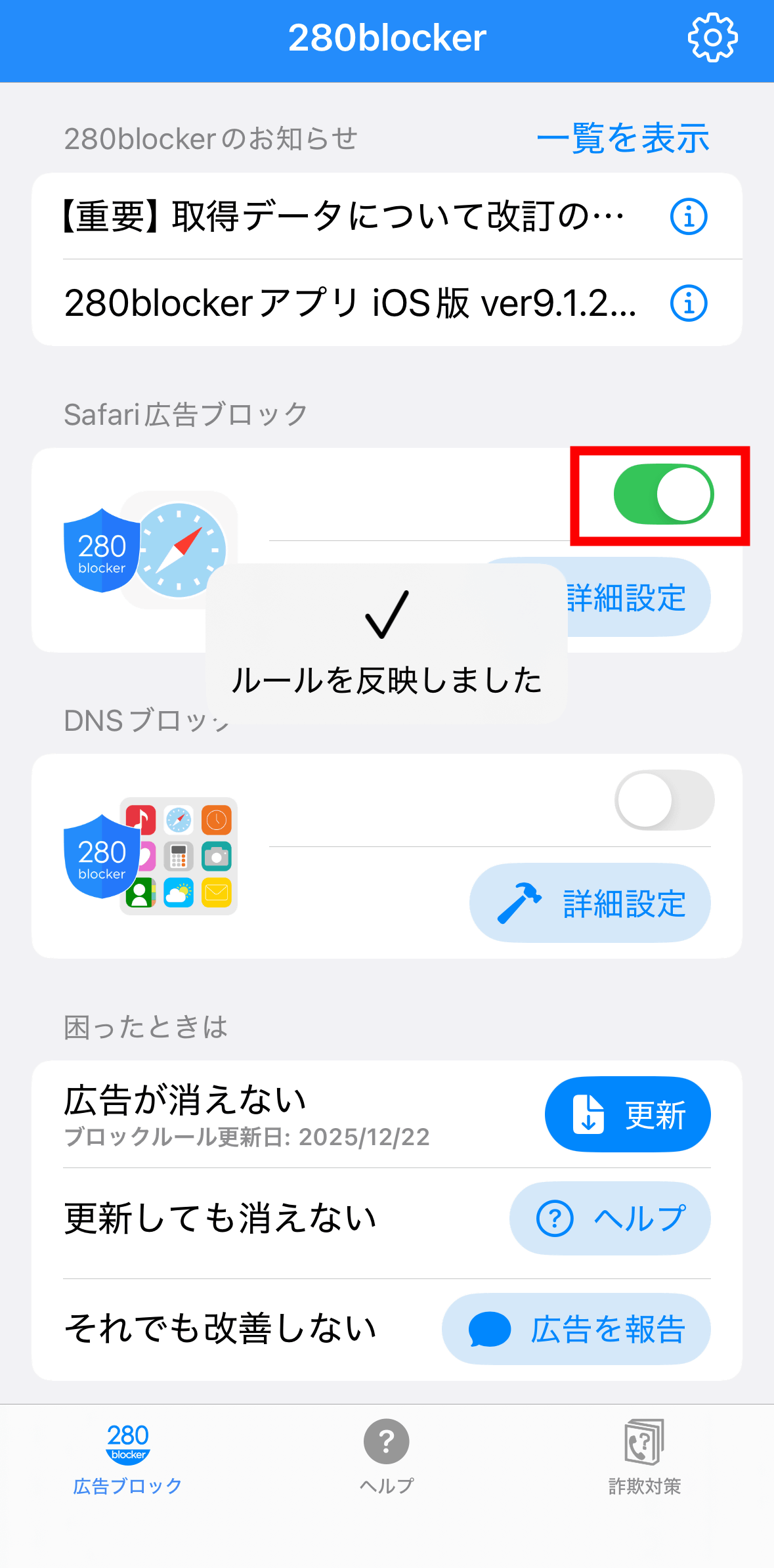 280blockerを開き、Safari広告ブロックのトグルスイッチをオンにすれば機能が有効化され、280blockerがブロックした広告はSafariで表示されなくなります。