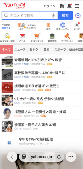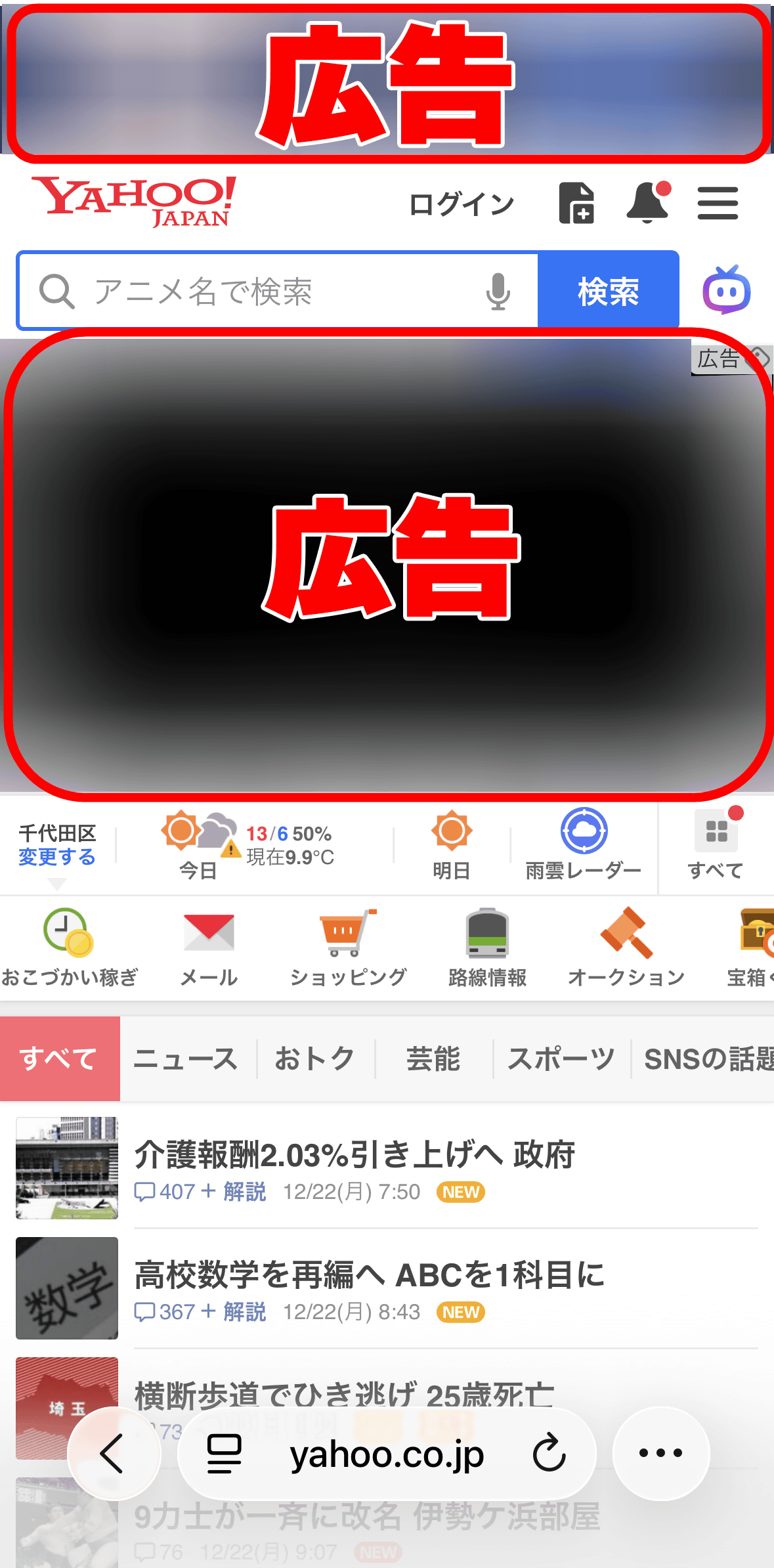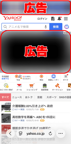 さっそくSafari広告ブロックの効果を確かめてみます。まずSafari広告ブロックをオフにした状態で、SafariからポータルサイトのYahoo! JAPANを開いてみると、トップ画面の上部にバナー広告が、そして検索欄の下にも広告が表示されました。以下の画像だと、赤枠で囲った部分が広告です。