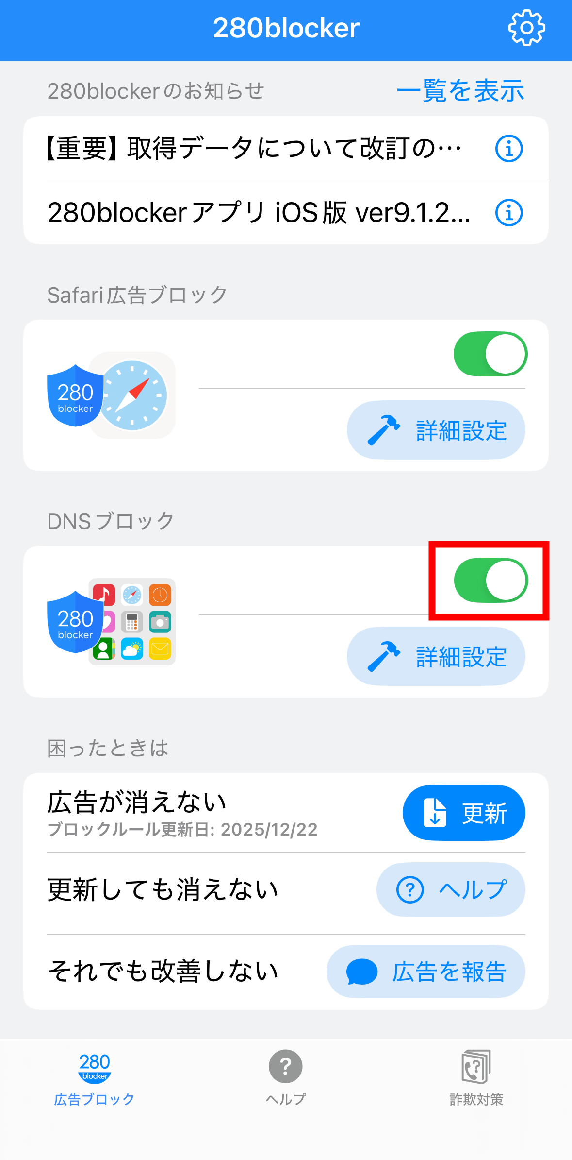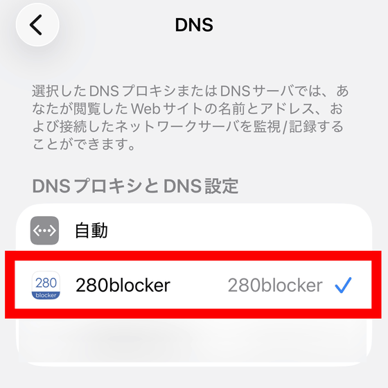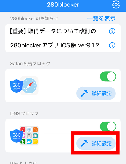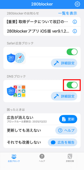 「DNSブロック」はSafari以外のアプリで広告をブロックする機能で、買い切り型のスタンダードプランでも利用可能。280blockerを開き、「DNSブロック」のトグルスイッチをオンにします。