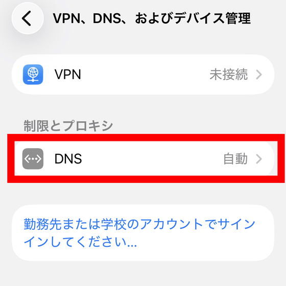 「制限とプロキシ」の欄にある「DNS」をタップします。