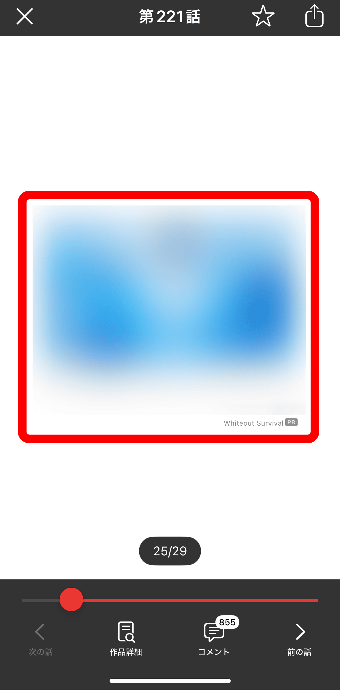 まず、DNSブロックをオフにした状態でマンガアプリを開いて読んでみました。1話分を読んだ後、最後に大きく広告が表示されました。