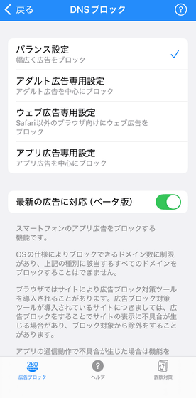 ・アプリ広告専用設定:アプリの広告のみをブロックする設定です。アプリの広告をブロックしたい場合に利用します。なお、バランス設定で消えないアプリの広告を消せる場合がありますが、DNSブロックの性質上、全てのアプリ広告を消せるわけではありません。