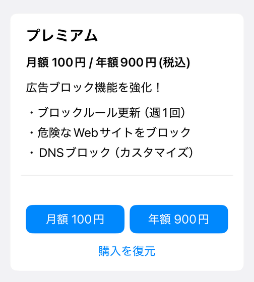 「プレミアムプラン」は月額100円/年額900円(税込)で加入できるプランです。スタンダードプランでは広告のブロックルール更新が月2回ですが、プレミアムプランでは週1回とより頻繁になります。