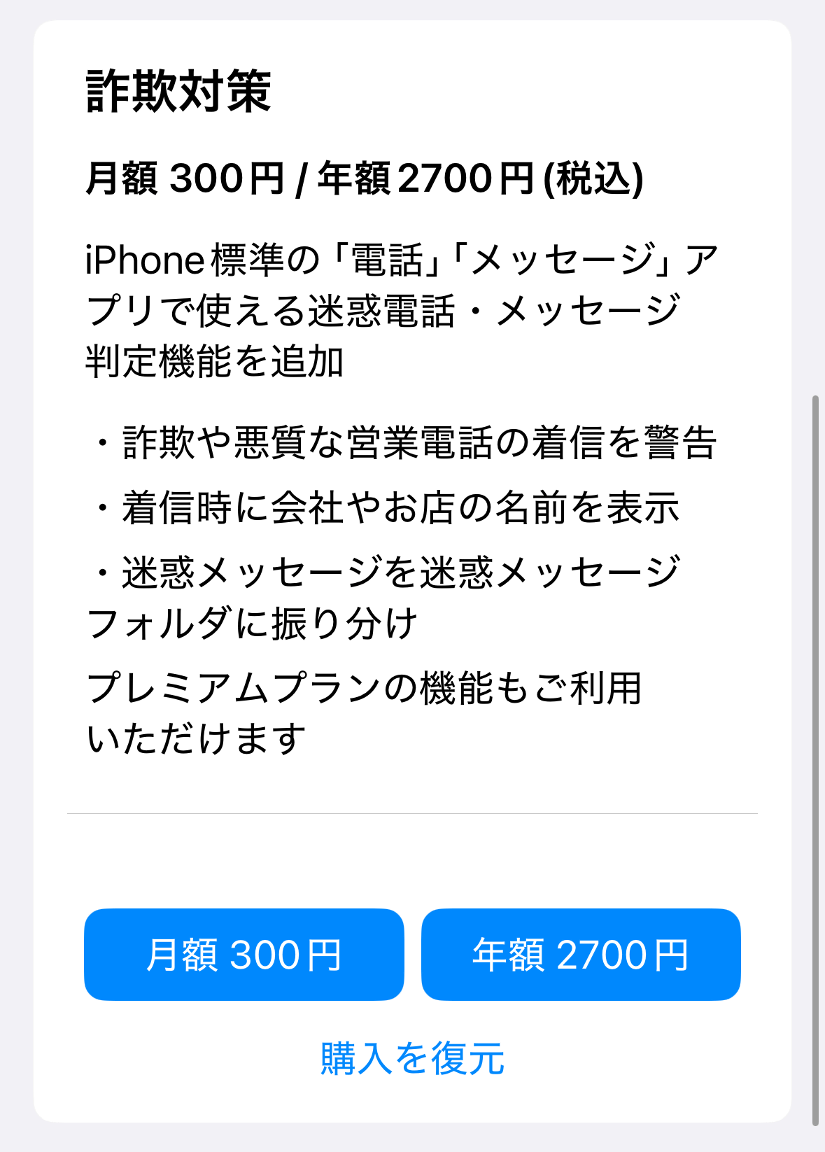 「詐欺対策プラン」は月額300円/年額2700円(税込)で加入可能。詐欺や悪質な営業電話の着信を警告したり、スパムメッセージをブロックしたりしてくれるほか、迷惑メッセージを自動的に迷惑メッセージフォルダに振り分けて隔離してくれる機能も利用できます。また、詐欺対策プランに入ればプレミアムプランの機能も自動で使えるようになります。