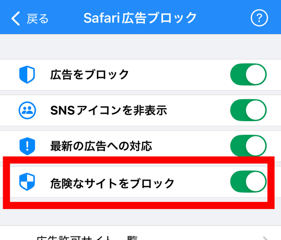 プレミアムプランでは「Webフィルタ機能」が追加され、Safari広告ブロックの「詳細設定」から「危険なサイトをブロック」をオンにできます。この「危険なサイトをブロック」は、トビラシステムズの迷惑情報データベースをもとに、フィッシングサイトなどセキュリティリスクのあるウェブサイトへのアクセスを防止できる機能です。
