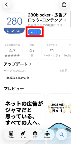 280blockerは800円の買い切りアプリで、追加で課金せずとも高頻度で広告ブロックルールが更新されるため、ウェブサイト側の変更に細かく適応できます。iPhoneに280blockerをインストールするには、まずApp Storeで280blockerのページを開いて「¥800」をタップして購入します。
