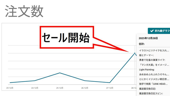 以下は、セール前後の作品購入数の推移を示したグラフ。毎日数件~数十件程度の注文数ですが、セールを告知した日には注文数が普段の数倍まで伸びていることが分かります。