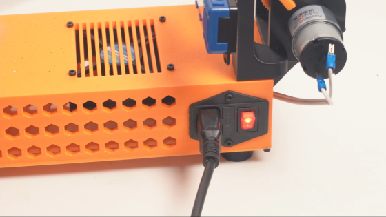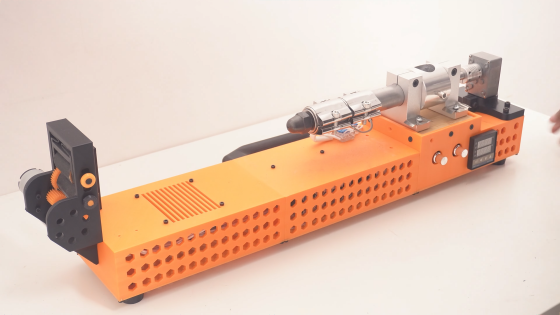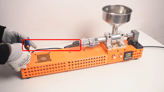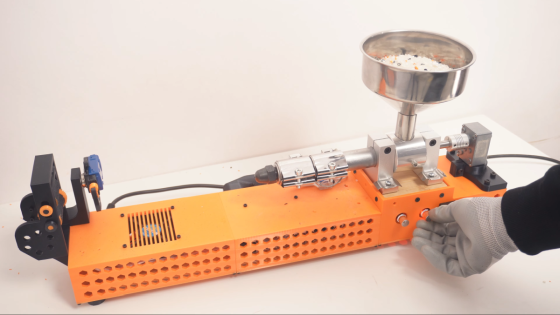 ペレットは内部でかき混ぜられるバレルを通過し、加熱されて反対側のノズルから押し出されます。押し出された直後のフィラメントは柔らかいため、最初だけはピンセットなどで糸をつかみ反対側のプーラー(フィラメントを引き取る装置)へ渡す作業が必要です。
